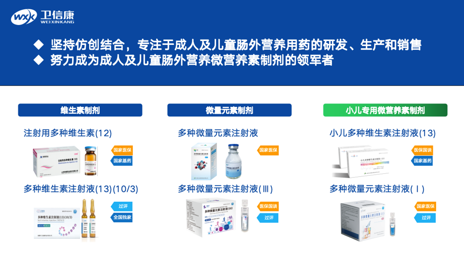 多年來,衛(wèi)信康深耕腸外營養(yǎng)微營養(yǎng)素制劑的研、產(chǎn)、銷一體化運(yùn)營,產(chǎn)品管線覆蓋了成人和兒童領(lǐng)域的多種維生素、微量元素等制劑品種,目前已成為該細(xì)分領(lǐng)域的國內(nèi)優(yōu)勢企業(yè)。已研發(fā)上市的核心產(chǎn)品涵蓋:注射用多種維生素(12)、多種維生素(13)(10/3)水針/粉針、多種微量元素注射液、小兒多種維生素注射液(13)、復(fù)方電解質(zhì)注射液(V)等。